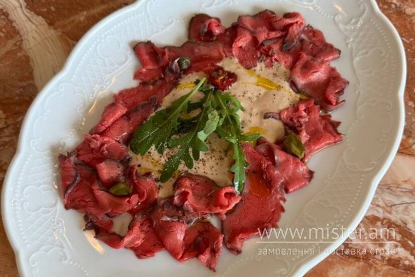 Класична північноіталійська "тунцова телятина": м'яка вирізка під традиційним соусом з тунця та анчоусів прикрашена руколою.