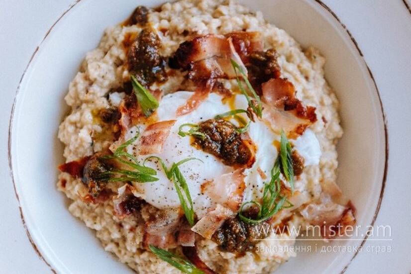Вівсяна каша на курячому бульйоні з пластівцями чилі - подаємо з яйцем-пашот, Песто власного виробництва та смаженим італійським беконом панчета.