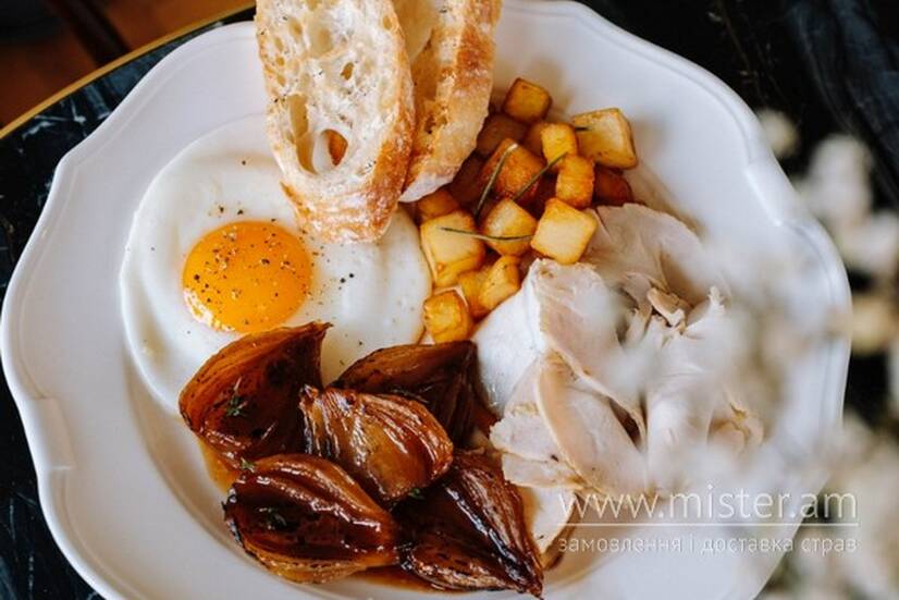 Пастрамі з індички власного приготування з бланшованою картоплею, яєчнею з одного яйця, Чіабатою від Шефа та карамелізованою цибулею з білим вином.