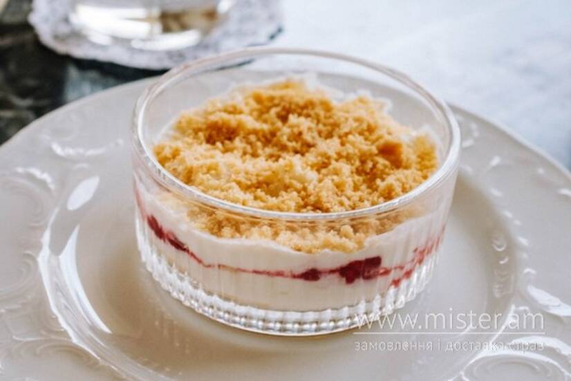 Чизкейк на основі грецького йогурту та кисломолочного сиру з малиною, медом та пісочною крихтою.