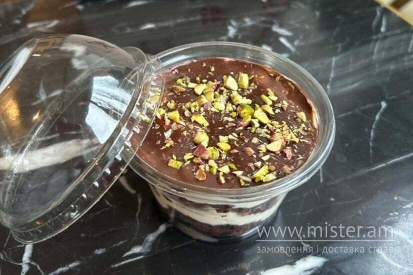 Поєднання глибокого смаку шоколаду й горіхової ніжності: шоколадний бісквіт, крем маскарпоне з фісташковою пастою та тахіні, а зверху — делікатний ганаш і щедра крихта фісташок.
