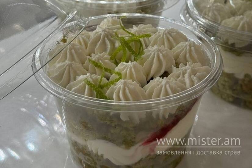 Ніжний шпинатний бісквіт, делікатно просочений м’ятним сиропом, у поєднанні з крем-чизом із сиру Філадельфія та вершків, яскраво доповнений полуничним джемом і нотами цедри лайма.