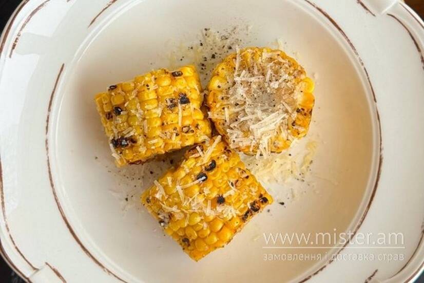 Ароматна гаряча кукурудза на качані під вершковим маслом, з легкою солоною ноткою та щедро присипана пармезаном.