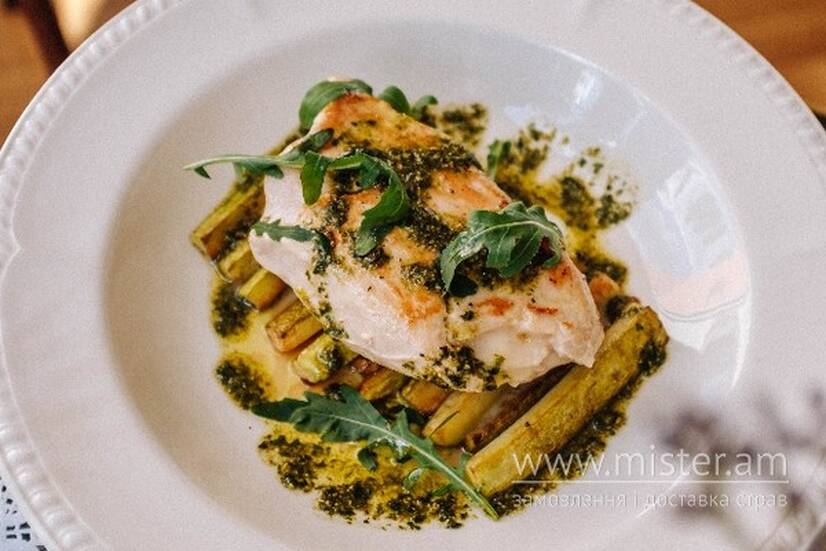 Філе індички, фаршироване спеціалітетами італійського регіону Вальда Оста - Прошуто Крудо, сирами Моцарела і Горгонзола. Подаємо з цукіні ала скапече.