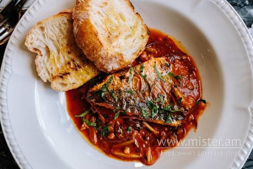 Ніжне філе дорадо з соусом з італійських томатів Пелаті, часнику, цибулі, петрушки, оливок та каперсів, деглазованим рибним бульйоном. Подаємо з часниковою Чіабатою від Пана Пекаря.