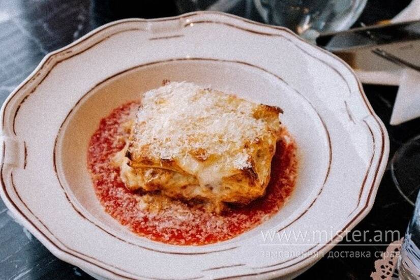 8 шарів пасти власного виробництва з п'ятигодинним соусом Болоньєз, соусом Бешамель і сиром Пармезан 24-місячної витримки. Подаємо на теплому соусі Неаполітана.