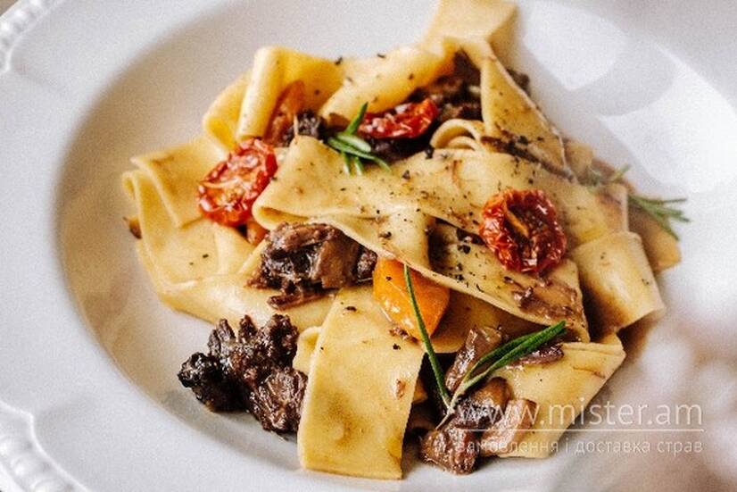 Тосканська широка паста ручної роботи з розмарином і рагу з яловичих щік, тушкованих протягом п`яти годин у червоному вині з класичним французьким набором овочів. Радимо супроводити келихом "сильного" вина