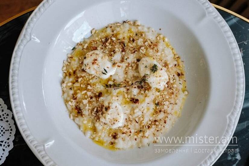 Ризото з традиційного рису сорту Арборіо на курячому бульйоні з сирами Горгонзола, Страчатела і Пармезан, горіхами фундук і мигдаль, трюфельним медом і тим`яном.