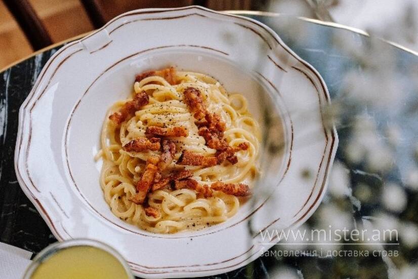 Спагеті ручної роботи з італійським беконом Панчета і традиційним соусом з жовтка, пармезана 24-місячної витримки і свіжомеленого чорного перцю.