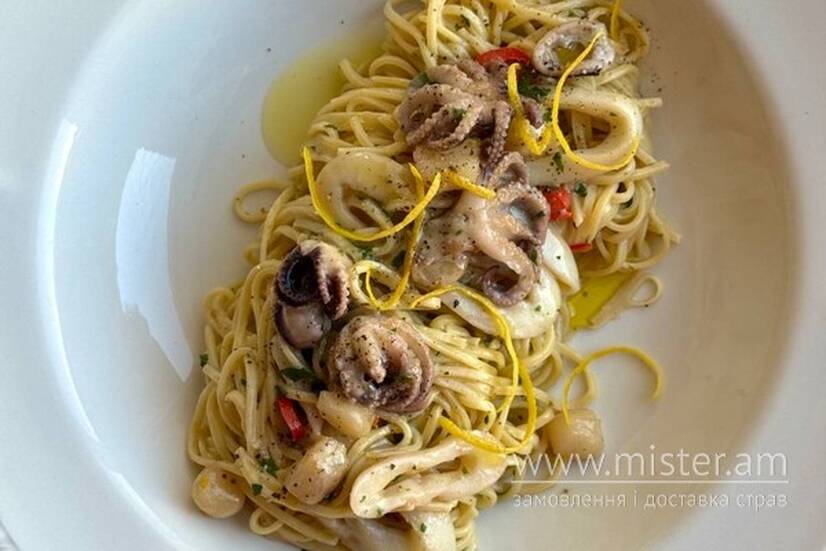 Яєчна пастаі у витонченому поєднанні з бебі гребінцем, бебі восьминогом та кальмаром. Морепродукти делікатно томляться у ароматному рибному бульйоні з вершковим маслом, доповнюються насиченим соусом біск та яскравим песто. Завершальний штрих — свіжа петрушка та цедра лимона, що додає страві легкої цитрусової свіжості та підкреслює природний смак моря.