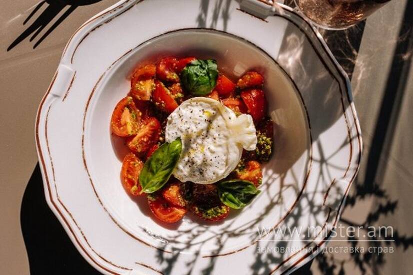 Італійська класика - фермерський м'який сир Буррата з вершками і моцарелою, томати чері, лігурійський песто власного виробництва.