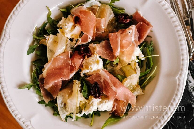 Салат з Прошуто Крудо, свіжою грушою, фермерським сиром страчатела, чері конфі і міксом зелені шпинат-рукола, подаємо з соусом з оливкової олії Extra Virgin та меду.