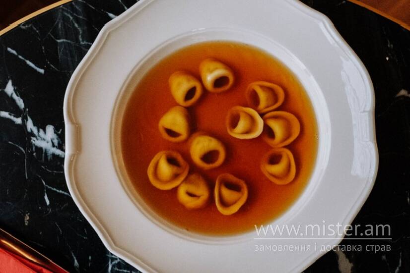 Шестигодинний потрійний бульйон (овочевий, курячий, яловичий) та мініатюрні равіолі з м`ясною начинкою.