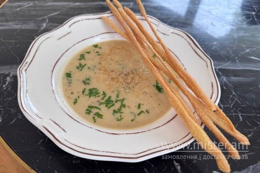 Італійський м`ясний кремовий суп на основі картоплі - з яловичиною, курячим бульйоном та вершками. Подаємо з чіпсами з пармезану, хрумкими грисині власного виробництва.
