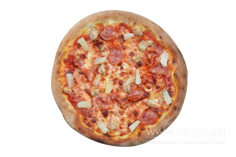 З ананасами, курячим філе, шинкою та моцарелою на вершковому соусі + соус до бортиків.