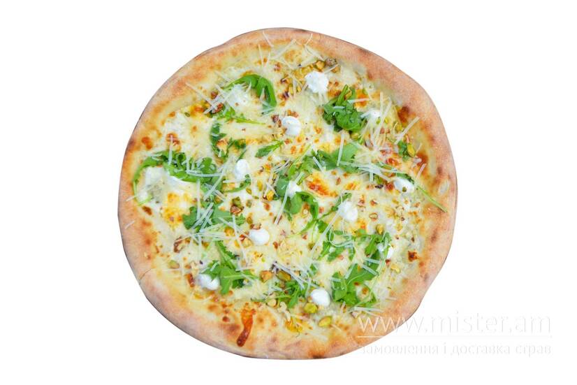 Вершковий соус, крем-сир Філадельфія, дорблю, пармезан, голандський сир, моцарела та фісташки з грецьким горіхом + соус до бортиків