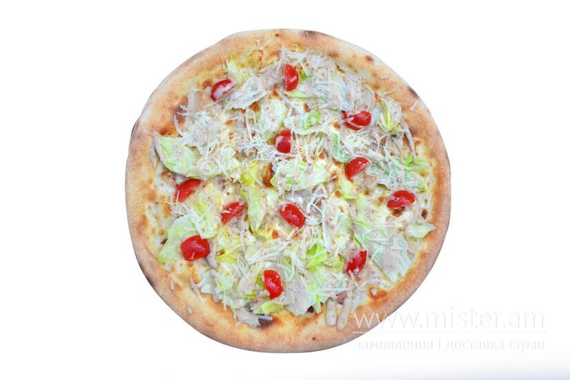 З курячим філе та беконом, айсбергом, томатами чері, соусом цезар та пармезаном на вершковому соусі + соус до бортиків.