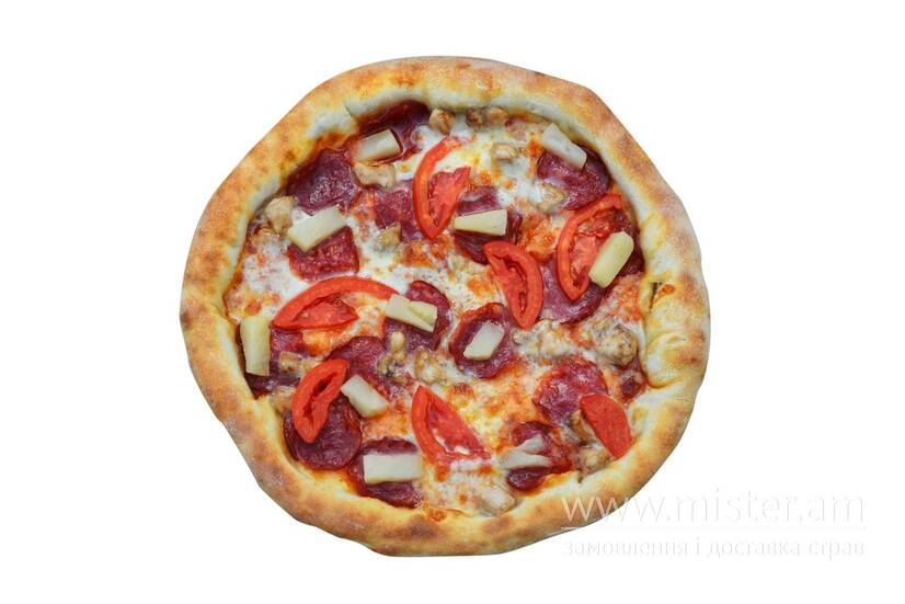 курячим філе, салямі, ананасами, томатами на соусі з цілих томатів та моцарелою + соус до бортиків.