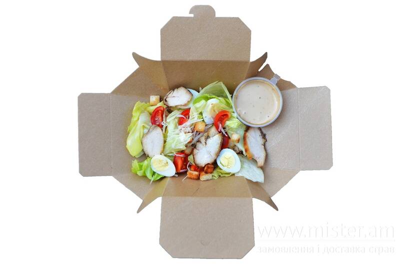 Салат айсберг, помідори чері, запечене куряче філе, крутони, перепелині яйця, пармезан, соус Цезар.