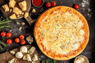 Фірмовий томатний соус, сири: Моцарелла, Дорблю, Пармезан, Чеддер.