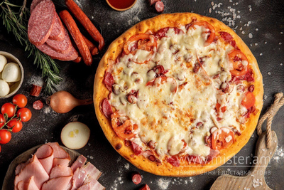 Фірмовий томатний соус, балик, бекон, мисливські ковбаски, салямі, маринована цибуля, томати, сир моцарелла
