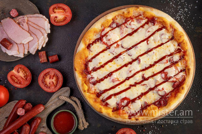 Фірмовий томатний соус, балик, мисливські ковбаски, томати, соус BBQ, сир Моцарелла.