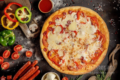 Фірмовий томатний соус, мисливські ковбаски, томати, перець солодкий, сир Моцарелла.