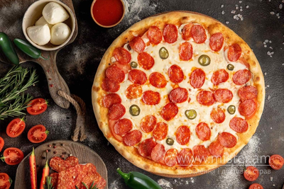 Фірмовий томатний соус, папероні, курка, томати, перець халапеньо, сир Моцарелла.
