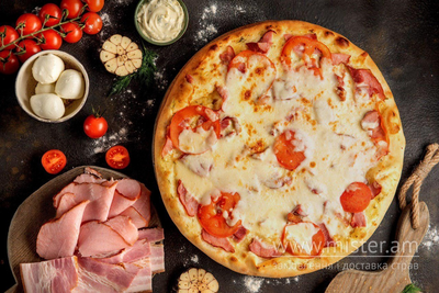 Фірмовий білий часниковий соус, балик, бекон, томати, сир Моцарелла