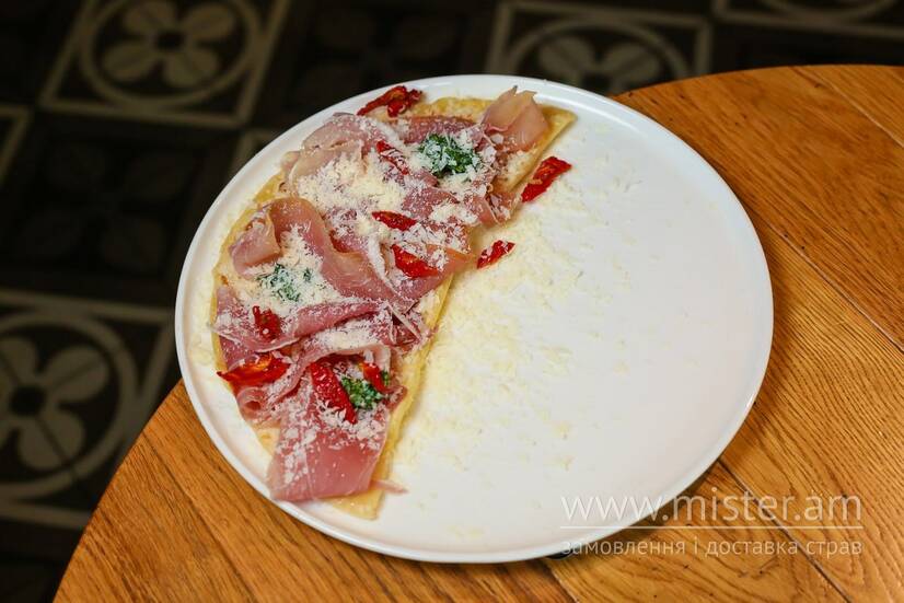 Тонке тісто з борошна, води та солі, запечене до золотистої скоринки, з начинкою з ніжного розплавленого сулугуні та вишуканого прошуто.