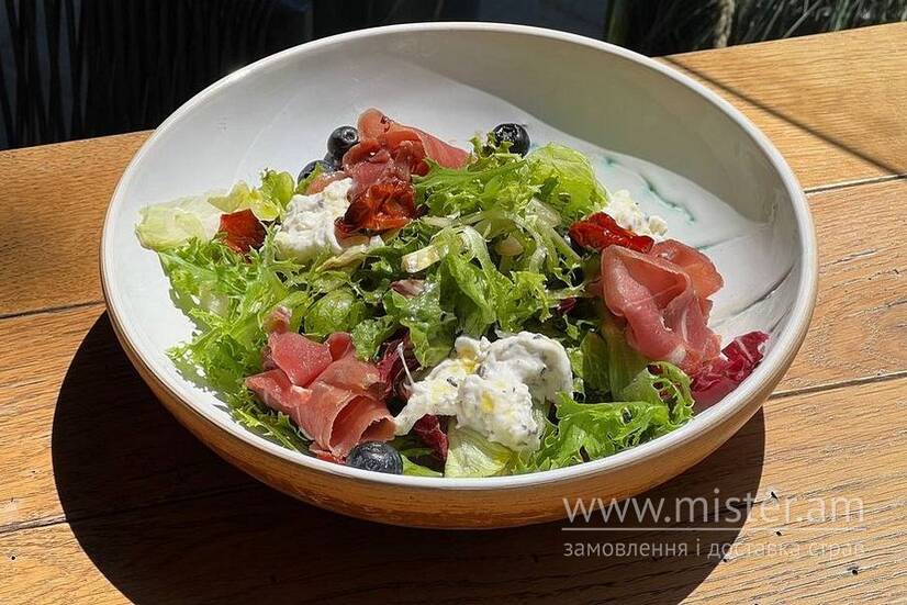 Мікс зелені, трюфельна страчатела, прошуто, базилік, фундук, томати конфі.