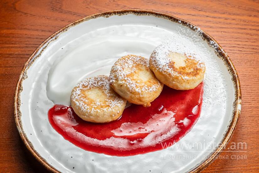 Ніжні солодкі сирники. Подаємо з грецьким йогуртом та ягідним конфі.