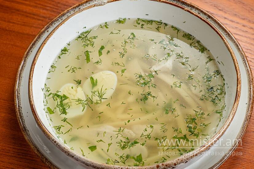 Поливка з домашньою куркою, локшиною, та омлетом