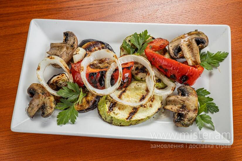 Смажені овочі на мангалі: кабачок, баклажан, болгарський перець, цибуля, гриби.