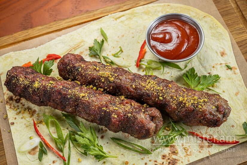 Ароматний люля-кебаб з яловичини та свинини, готуємо на "живому вогні" та подаємо на лаваші з соусом Сацебелі.
