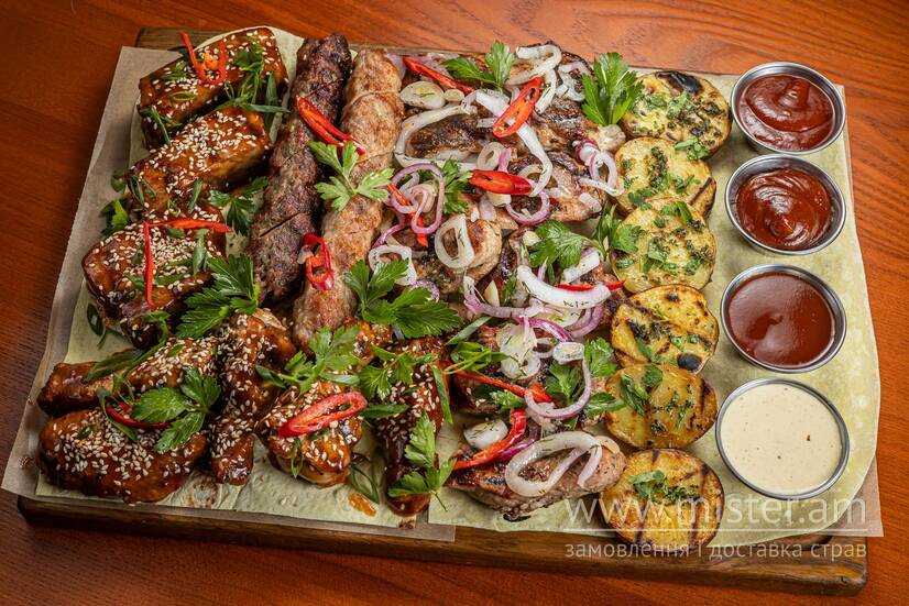 Шашлик з свинини та фірмові ребра, курятина та костиця, люля-кебаби з індички та яловичини з четвіркою соусів.