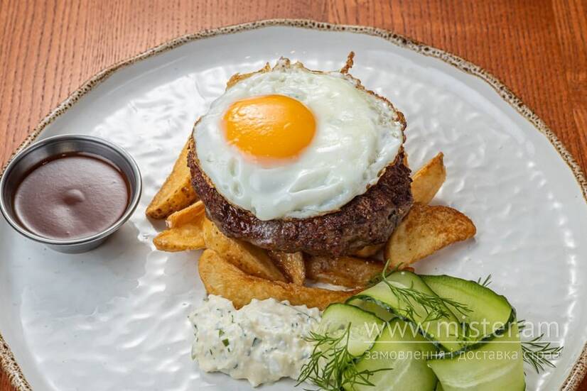 Соковитий біфштекс з рубленого м`яса яловичини та свинини, подаємо з картопляними дольками, яєшнею та соусом BBQ.