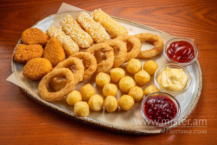 Сирна паличка чеддер в сухарях панко, курячі нагетси, цибулеві кільця, картопляні крокети.