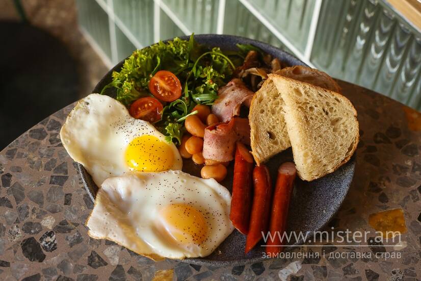 Класична яєшня з підсмаженими мисливськими сосисками, ароматним беконом, смаженими грибочками, квасолею та зеленим салатом у медово-гірчичному соусі.