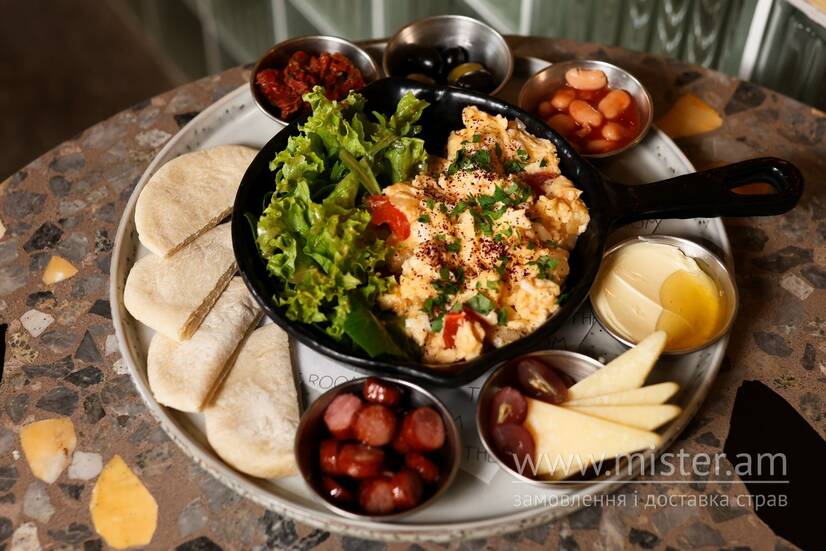 Турецький томатно-овочевий омлет менемен зі свіжим салатом у медово-гірчичному соусі та шістьма додатками: мисливські ковбаски, нутовий хумус, оливки, сир, рідкий мед з вершковим маслом, в`ялені томати і до всього подаються печені піти.