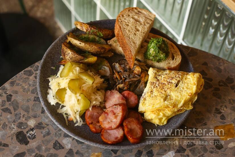 Дуже український сніданок з вершковим омлетом з двох яєць, підсмаженою домашньою ковбаскою, з печеною картоплею, смаженими грибами та соліннями, підсмаженим хлібчиком та салом-намазкою з кропом.