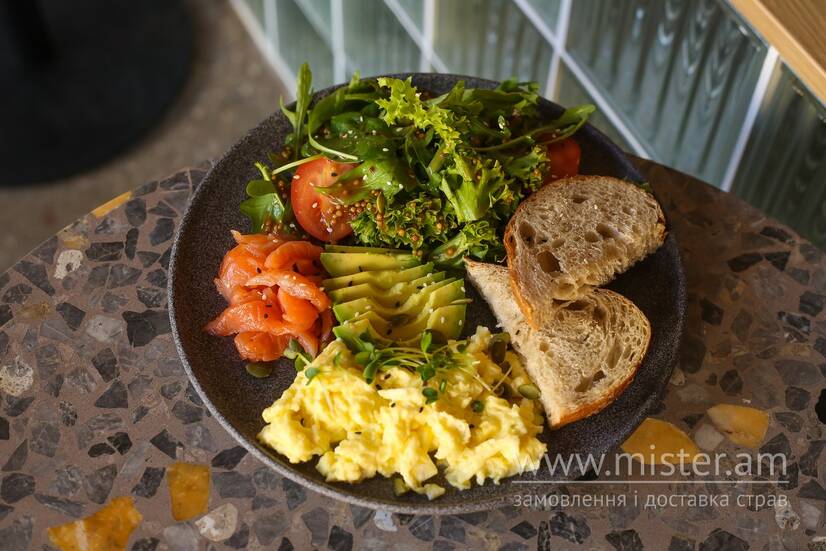 Cлабосолений лосось власного посолу, авокадо, скрембл з двох яєць, мікс салатів з томатами чері у медово-гірчичному соусі, підсмажений тост, мікрогрін, кунжут та гарбузове насіння.