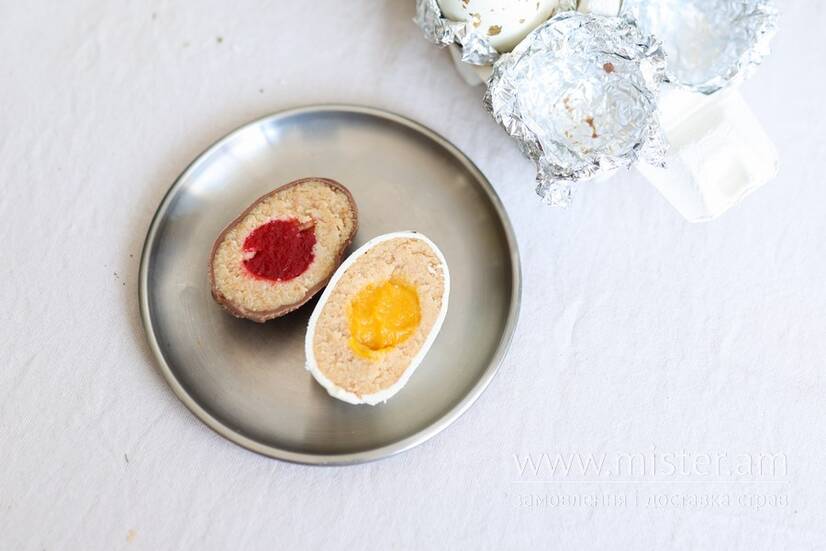 Як наше легендарне тістечко "Картошка", тільки з манговим або полуничним жовточком у молочному та білому шоколаді.