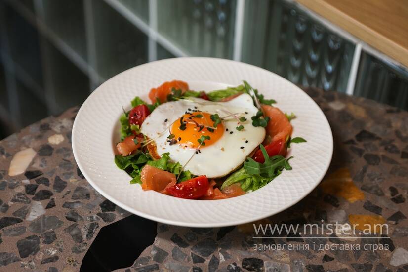 Соковитий хешбраун з тертої картопельки зі слобосоленим лососем власного посолу, крем-сиром, яєшнею, міксом салату, томатом та кунжутом.