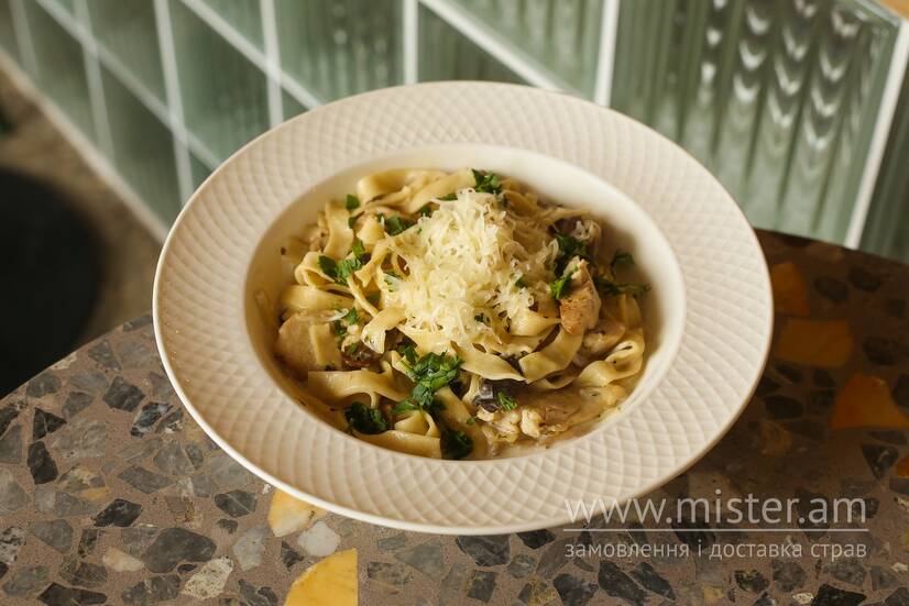Ніжна локшина власного виробництва з курочкою та підсмаженими грибами гливами у вершковому соусі з пармезаном.
