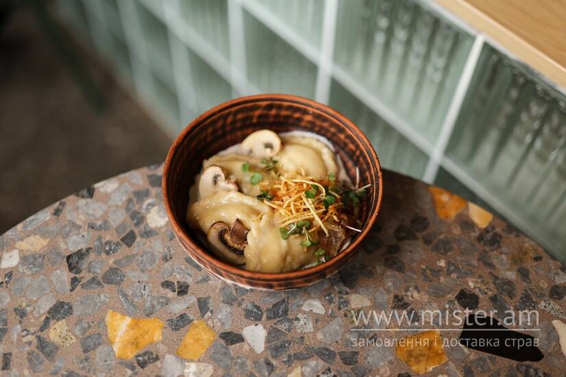 Вареники з картоплею та грибами у грибному соусі з тонкою хрумкою картоплею фрі.