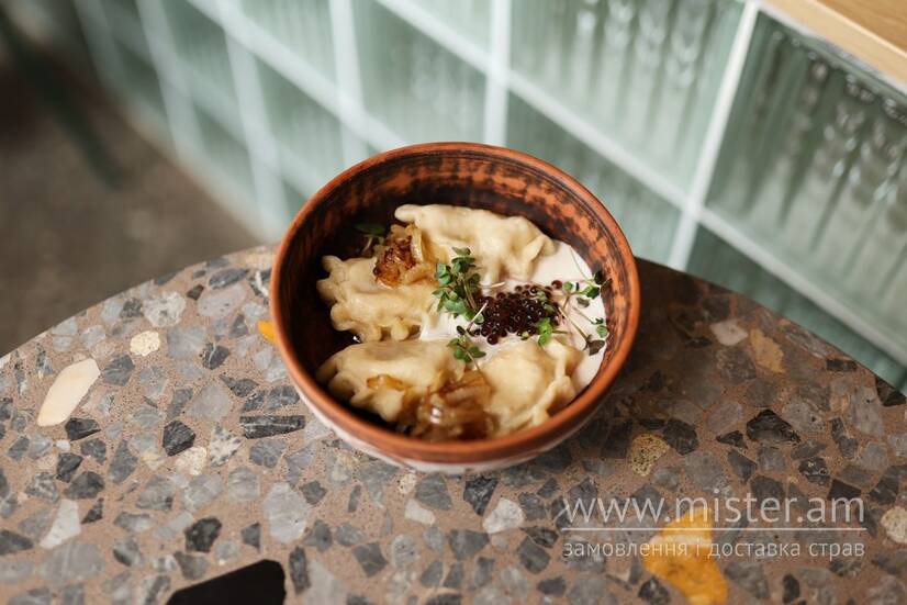 Вареники з яловичиною і свининою у сметані з карамельною цибулькою та бальзамічною ікрою.