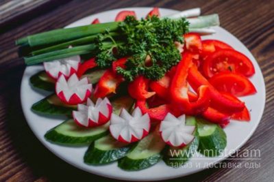 Огірки свіжі, томати свіжі, перець болгарський, редька, цибуля зелена, зелень