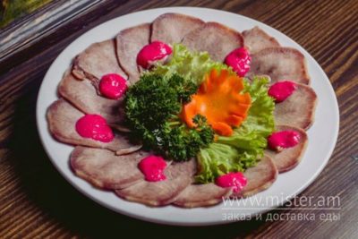 Холодні закуски: Асорті "Дари моря", Ікра червона, Оселедець з цибулею, Асорті "М`ясне", Асорті "Домашнє", Сало свіже, Сало бутербродне, Язик з майонезом та часником, Асорті "З грядки", Гриби мариновані, Бутерброд з червоною ікрою, Асорті "З бочки", Карпачо з лосося, Бутерброд з сьомгою, Асорті "Сирне", Маслини / Оливки, Лимон