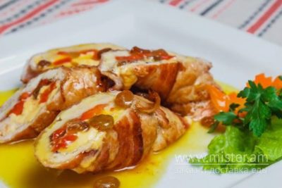 Філе індічкі, бекон, сир, болгарський перець, родзинки, мед, соєвий соус, зелень